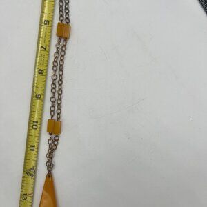 Beautiful genuine vintage Bakelite necklace in the classic butterscotch color, featuring a long 28” brass chain with natural patina and geometric phenolic resin components. The tapered pendant has strong marbling and glow typical of early Catalin/Bakelite from the 1930s–40s.