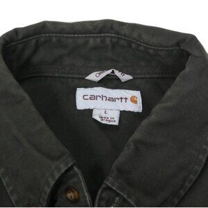 Vtg CARHARTT Gray Button Up Work Shirt New York Drilling Patch Mens sz L /839