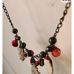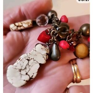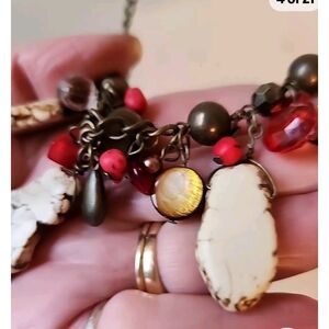 Preowned. Very good condition. No excessive use or wear. Brown, reddish, cream, antique brass colored beaded and stone-granite looking pieces on a 9.5" adjustable necklace.