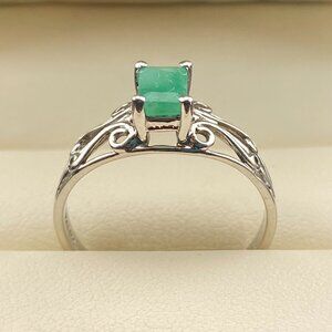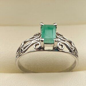 Designer: Petite type filigree ring with swirls and curls in the band. Elegant and smooth with white gold and green emerald, classic.