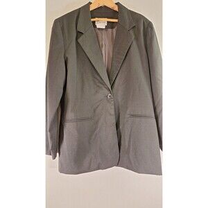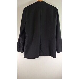 Elevate your wardrobe with this vintage Courtenay blazer jacket, perfect for any occasion from formal to casual wear. The single-breasted design with button closure and long sleeves make it a classic piece while the mid-length and knit fabric type add a touch of modernity. The black solid pattern and button accents give it a versatile appeal suitable for any theme from geek to bohemian, making it a must-have for any fashion-forward woman's collection. This blazer is a regular fit, size 12, and is dry clean only. PTP 22.5in. Length 31in.