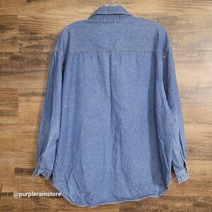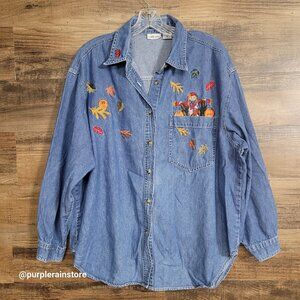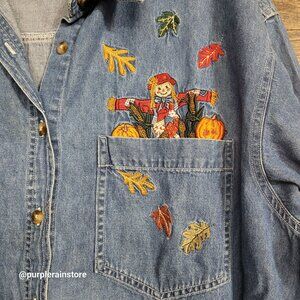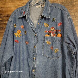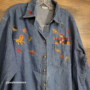 Vtg Cabin Creek Denim Shirt Size 20 Embroidered Fall Pumpkins Scarecrow Leaves