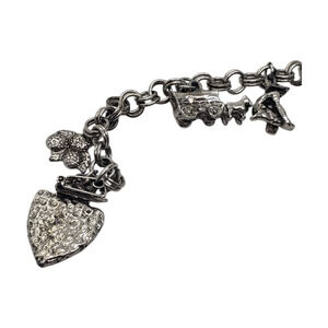 Notes: No maker's hallmark or metal content stamp found on the bracelet or charms. Reverse of the shield charm shows a textured finish.