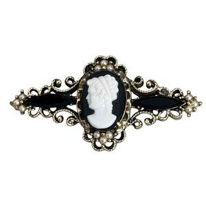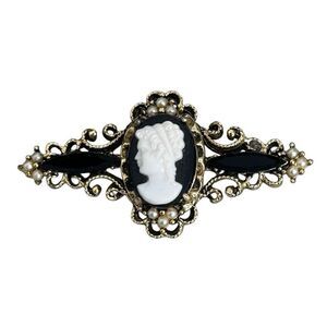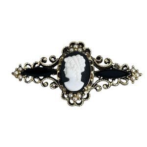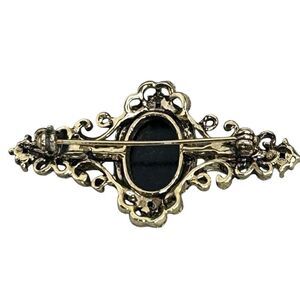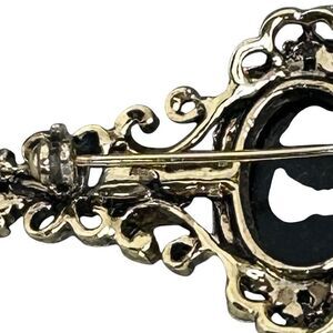 White lady silhouette on a black background, set in an elegant gold-tone filigree frame w/ black onyx. Measuring approximately 2.5" wide by 1" deep, it showcases intricate detailing that enhances its timeless charm. The brooch is secured with a reliable rollover clasp closure.