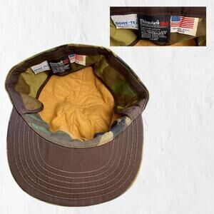 This is a vintage cold-weather cap crafted from camouflage fabric, designed for outdoor use and maximum warmth. It features Gore-Tex and Thinsulate insulation, providing both water resistance and a high level of thermal protection. The front panel has an embroidered patch, making it a distinctive piece for collectors of utility and workwear apparel.