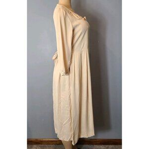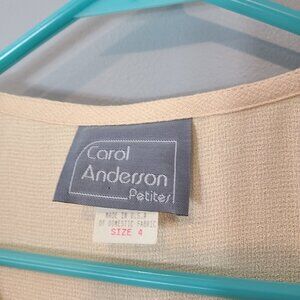 This product is a vintage Carol Anderson cream dress from the 1990s, designed in a cottage style with a 3D rose detail. The dress is in size 4P for petite women, featuring an empire waist and made of rayon material. With a whimsical Victorian look, this original day dress was created in the United States, making it a unique and charming addition to any vintage clothing collection.