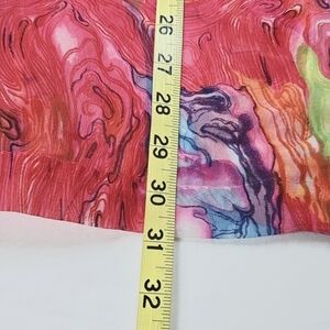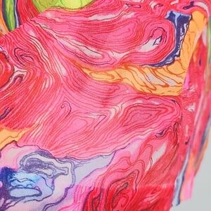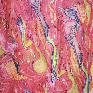 Stand out with this vibrant multicolor vintage shirt. Perfect for adding a splash of color to your wardrobe. Vintage Carol Henry 70s Vibrant Marbled Button Up, Sheer, LS, Large, Pink Blue Orange.