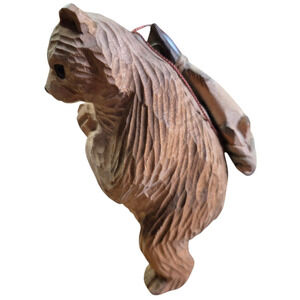 These bears are in excellent condition. Each bear has amazing and unique detail with a specific job to do. One has the job of bringing home fresh fish, another has a bundle of fresh, chopped wood, the other is attempting to start a fire with a stick, and the big guy just chopped down a huge pine tree to bring back to camp. This is an amazing, one-of-a-kind set that will create interest and blend beautifully into rustic decor, or they can be the focus of cabin decor. They have red string if you choose to hang these bears on you Christmas tree, or they are self standing if you choose to display them on a shelf or mantel.