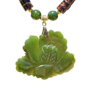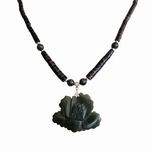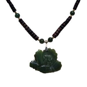 Vtg Carved Green Jade Flower Beaded Pendant Necklace 18” Coconut Shell Beads