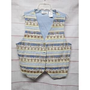 This is a cute vintage set from Casey & Max, although the pieces could definitely be mixed and matched to create other outfits. The shirt has animals on the blue pinstripe fabric. The vest has patterned stripes that coordinate with the shirt. The chest on the shirt measures about 46", with a length of 29" in the back. The vest is about 42" in the chest. Both are size large. 100% cotton, made in India. The shirt has a little minor discoloration on the inside of the collar. Thanks for looking!