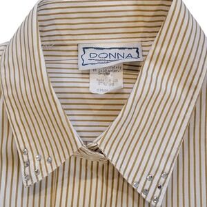 Vtg Cat Lady Button Up Shirt Sm Striped Beige Balinese Ragdoll Bling Donna USA
