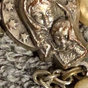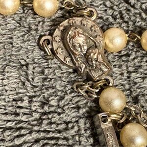 The product is a vintage Catholic 18-inch rosary with Art Nouveau faux pearl beads, featuring white Madonna and Child imagery. Made in Italy, this collectible piece is a beautiful representation of Christianity and spirituality. The combination of the delicate faux pearl beads and the religious imagery make this rosary a unique and meaningful addition to any collection or personal prayer practice.