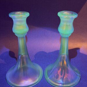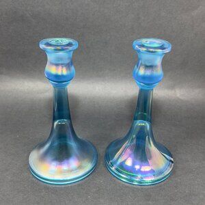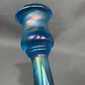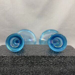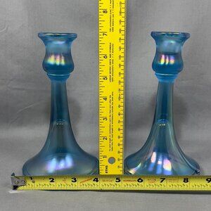 Vtg Central Glass Works Iridescent Blue Stretch Trumpet Candlestick Holders Glow