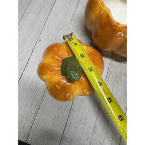Charming vintage ceramic jar featuring a vibrant orange pumpkin design with a lid. Perfect for autumn decor or as a festive storage solution.