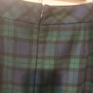Chadwicks of Boston vintage wool blend pencil skirt in a classic navy blue and dark green tartan plaid. Petite size 14. Mid-length/midi with a back slit/kick pleat and rear zip closure. Fully lined. Perfect for professional, preppy, Dark Academia, or holiday looks. Shell: 49% Wool, 51% Polyester. Lining: 100% Polyester. Care: Dry Clean Only. Length 30in. Excellent pre-owned condition.