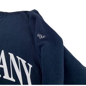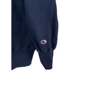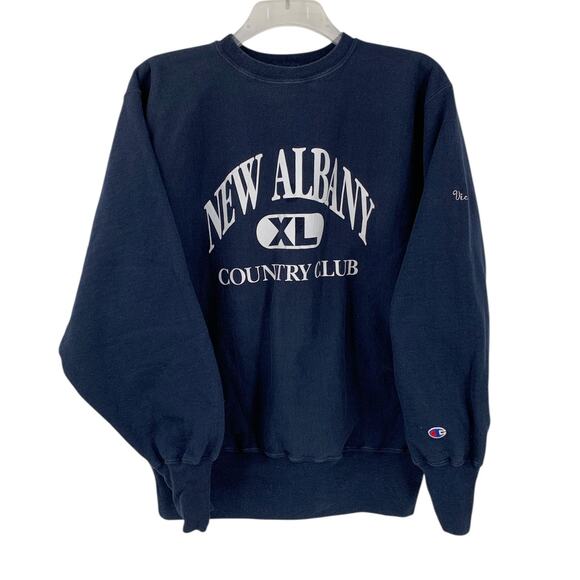 The product is a vintage Champion Reverse Weave sweatshirt in size XL, featuring a solid blue color and a crew neck with long sleeves. Made from a cotton blend knit fabric, this pullover sweatshirt is machine washable and suitable for all seasons. The design includes a New Albany Country Club logo accent, and is ideal for gym & training activities. Made in Mexico, this regular fit sweatshirt is a stylish and comfortable addition to any man's wardrobe.