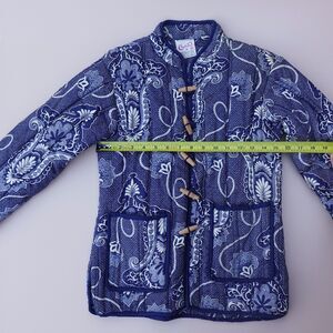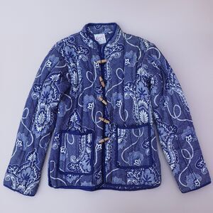 Vintage Chandni women’s quilted jacket in size Medium, featuring a stunning blue and white floral and paisley-inspired print. Made from 100% cotton, this lightweight jacket includes artisanal frog button closures, two functional front pockets, and a timeless boho aesthetic. Crafted in Pakistan, it reflects global-inspired fashion and intricate craftsmanship.