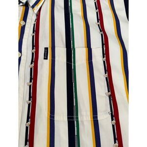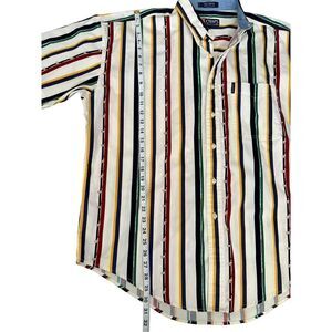 Pre owned chaps by Ralph Lauren button down shirt golf theme. The shirt is white with stripes that are yellow, green, red, purple and navy. No visible damage. Please look over the photos carefully.