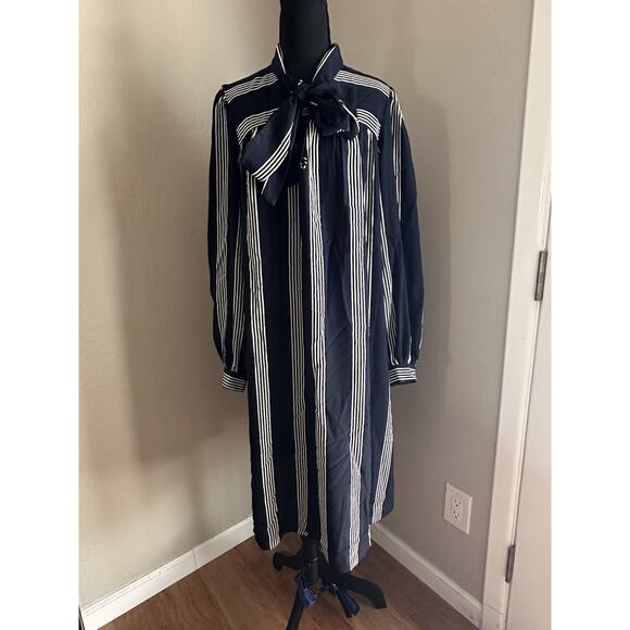 Vtg Chez California Designed By Tandy Navy White Striped Collar Neck Tie Dress
