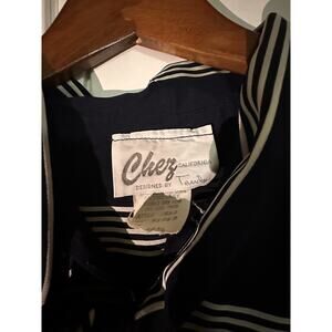 This vintage Chez California dress designed by Tandy features a navy and white striped theme with buttons at the top, a collar and a neck tie. The blouson style dress is made of polyester and is a size 8. It was manufactured in the United States in the 1980s and is suitable for day dress occasions.