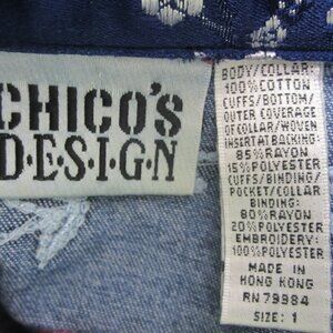The product is a vintage Chico's denim jacket in a blue color with red and gold floral embroidery. The jacket features a pewter button closure, long sleeves, and a regular fit. Made of cotton denim, it is machine washable and perfect for casual occasions. This classic piece of women's clothing adds a stylish touch with its unique pattern and accents, making it a versatile and eye-catching addition to any wardrobe.