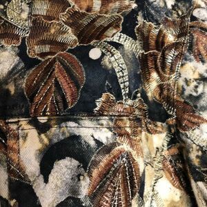 Beautiful trucker style jacket in a colored denim/twill type fabric. Fabulous, retro style in a rich fall color palette, that will carry into winter as well. Embroidery and beading add detail and design. In excellent condition.