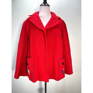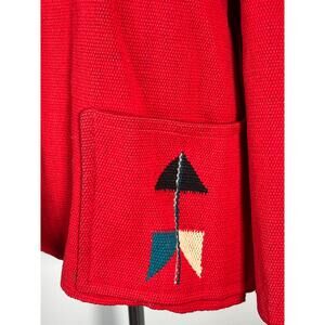 Stunning, red wool jacket made from a genuine Chimayo weaving from El Grandee by Fred Harvey. Historically a Southwestern tourist souvenir, these vintage jackets have become incredibly collectible. This is a gorgeous example in a warm red wool with multi colored woven accents. It has a one-size flatters a few open swing shape and is in very good condition.