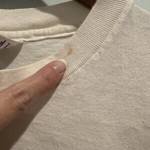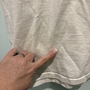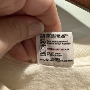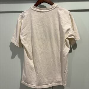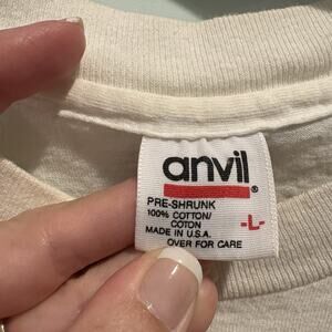This vintage white t-shirt by Anvil features a crew neck and short sleeves, with a classic pullover closure. Made of 100% cotton, the shirt is adorned with a charming design showcasing ponies and dolphins, giving it a unique touch. The top is in a size large and has a regular fit, perfect for a casual and comfortable look. This nostalgic piece is made in the United States and is machine washable for easy care.