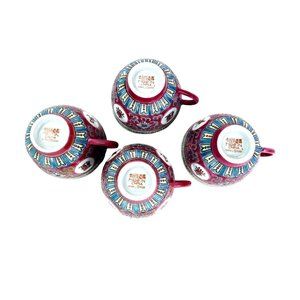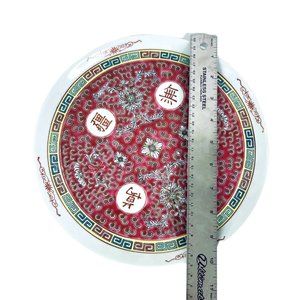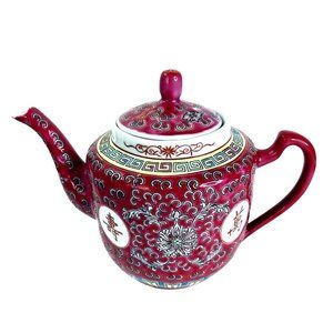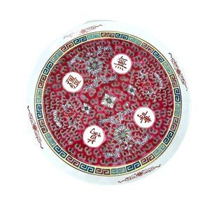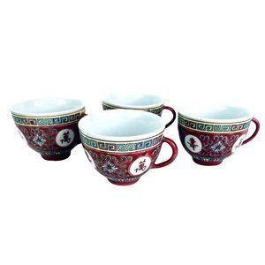 Vintage Chinese Famille Rose Porcelain Longevity Tea Set Jingdezhen. 6 hand painted pieces including teapot with lid, 4 cups with handles and serving tray plate. The teapot is about 6.5" tall by 9" long from handle to spout. The cups are just over 2.5" tall and the plate is 9.5" across.
