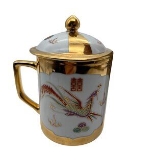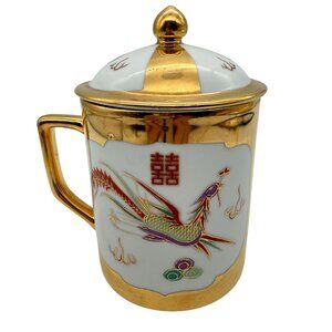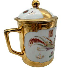Vtg Chinese Golden Dragon Red Phoenix Ceramic Tea Mug & Lid Gilt 2 Sided