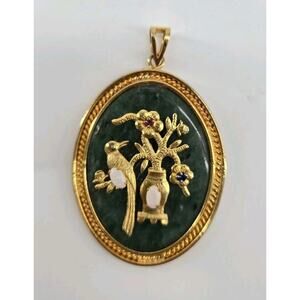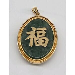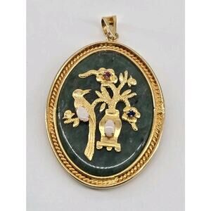 Vtg Chinese Jade Blessings Fortune Pendant Opals Red And Blue Stone Gold Tone