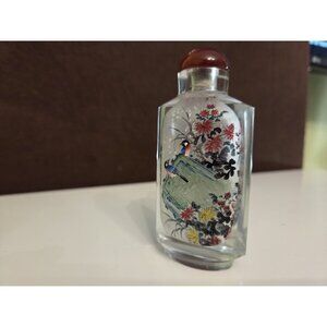 This vintage Chinese snuff bottle features intricate reverse painted birds, flowers, and cherry blossoms on heavy glass with glass stopped.