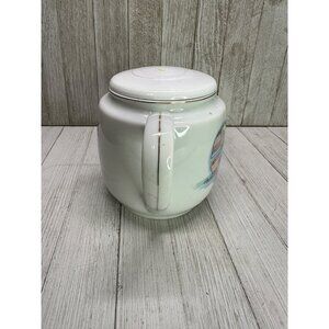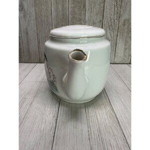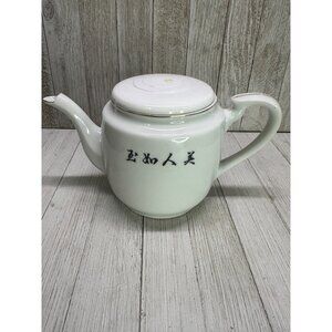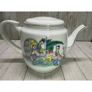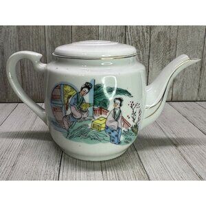 This vintage Chinese teapot features a beautifully detailed Asian scene design. Made of porcelain, it stands 5 inches tall and is perfect for collectors or tea enthusiasts seeking a unique and elegant piece for their collection.