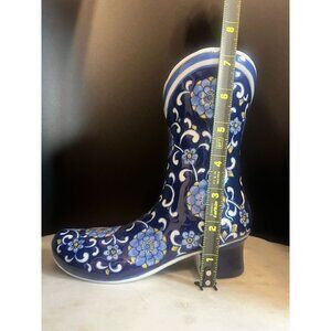 Vtg Chinoiserie Western Cowboy Boot Porcelain Vase Blue White Floral Texas Rodeo