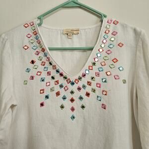 Vtg Choices White Tunic Blouse Top Multicolor Embroidered Reflective Accents Sm