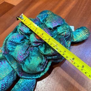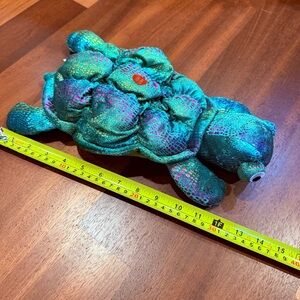 Bring home a unique plush from Chosun International — known for their vibrant and metallic fabric designs. This plush turtle features a shimmering teal, green, and gold scale pattern with a soft gold velour belly. Vintage 2000s