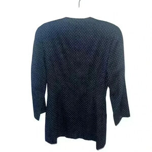Oversized shoulder pads Color is mainly black with white very fine pattern.