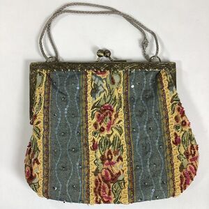 Vtg Christiana Beaded Purse Hand Bag Embroidered Floral Victorian Style Tapestry