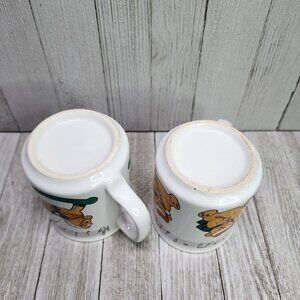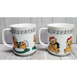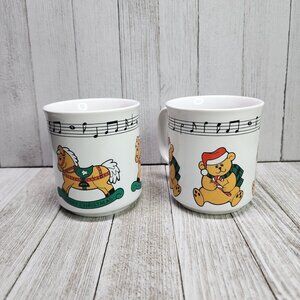 Vtg Christmas Coffee Tea Mugs Teddy Bear & Rocking Horse Music Notes Set Of 2