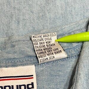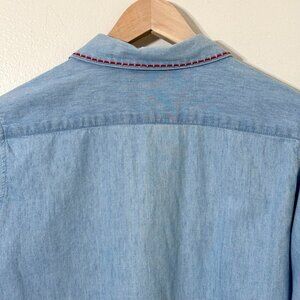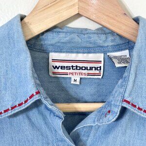 Vintage Westbound Petites Christmas denim button down shirt with embroidered holiday stamps of Santa Claus, wreath, bells and a house. Red embroidered stitching along collar.