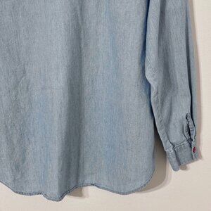 Vtg Christmas Stamps Denim Button Down Shirt Embroidered Holiday Festive Teacher