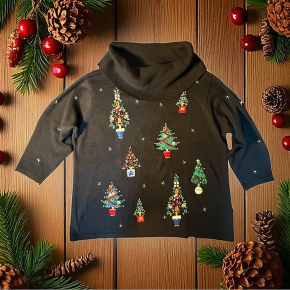 Vtg Christmas Sweater women's 2X Turtle Neck Embroidered Festive Trees Stars