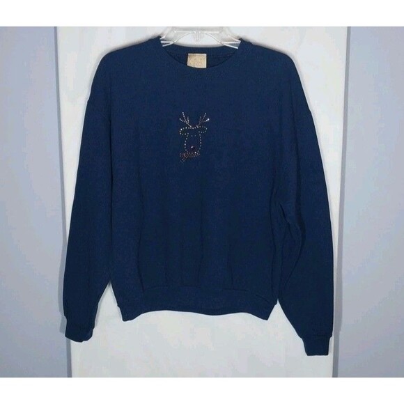 This vintage Christmas sweatshirt in size M features a navy blue color with a solid pattern and a crew neck neckline. Made of a blend of polyester and cotton fleece fabric, it has long sleeves and a pullover closure. The sweatshirt is adorned with an embellished reindeer accent, perfect for a Rudolph-themed holiday look. The oversized style and easy-care features make it a cozy and comfortable addition to your Christmas wardrobe.