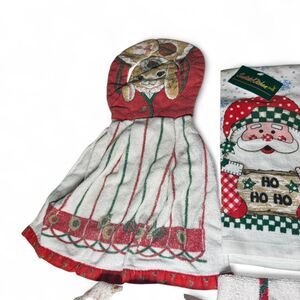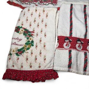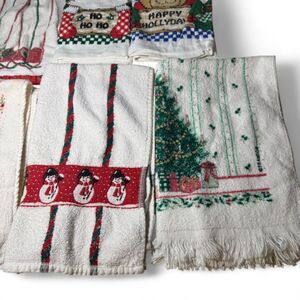 Vtg Christmas Towels Lot of 6. Festive holiday-themed towels featuring classic Christmas prints and colors — perfect for retro holiday decor or kitchen display. One towel has a stain, pictured for reference. Fair to good preowned condition.