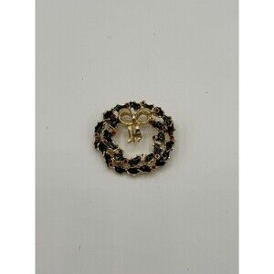 Vtg Christmas Wreath Brooch Gold Tone W Red & Green Enamel Rhinestones 1 3/4”