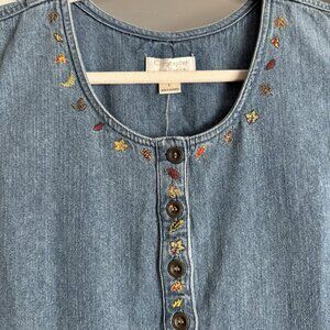 Vintage Christopher & Banks Denim Maxi Dress Embroidered Autumn Fall Leaves Folk Art