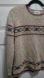 Charming tan sweater with intricate multicolor designs. Crew neck and long sleeves. Perfect for everyday style.