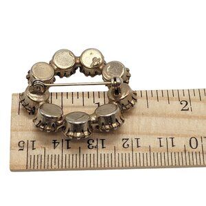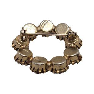 This brooch features a circle wreath design with sparkling rhinestones set in gold-tone metal. A classic piece to elevate vintage-inspired attire.