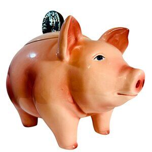 Vtg Clay Art Hand Painted Piggy Cookie Jar 1999 Unique Lid with Chrome Coin READ