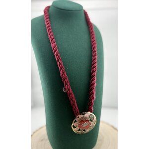 Elegant vintage statement necklace featuring a round cloisonné enamel pendant with a red flower design on a gold-tone base. The pendant hangs on a thick burgundy twisted cord with brass-tone end caps and a secure screw barrel clasp.